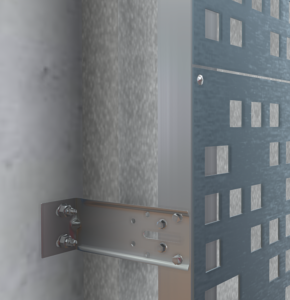 Le système de d’installation de bardage de type TIQA reste le plus connu du marché. Basé sur un profil vertical en forme de « T », c’est la technique de pose la plus facile à comprendre : une équerre sert d’écarteur pour déporter le « T » du béton, ensuite on visse les panneaux perforés sur l’aile de profil. Le tour est joué !