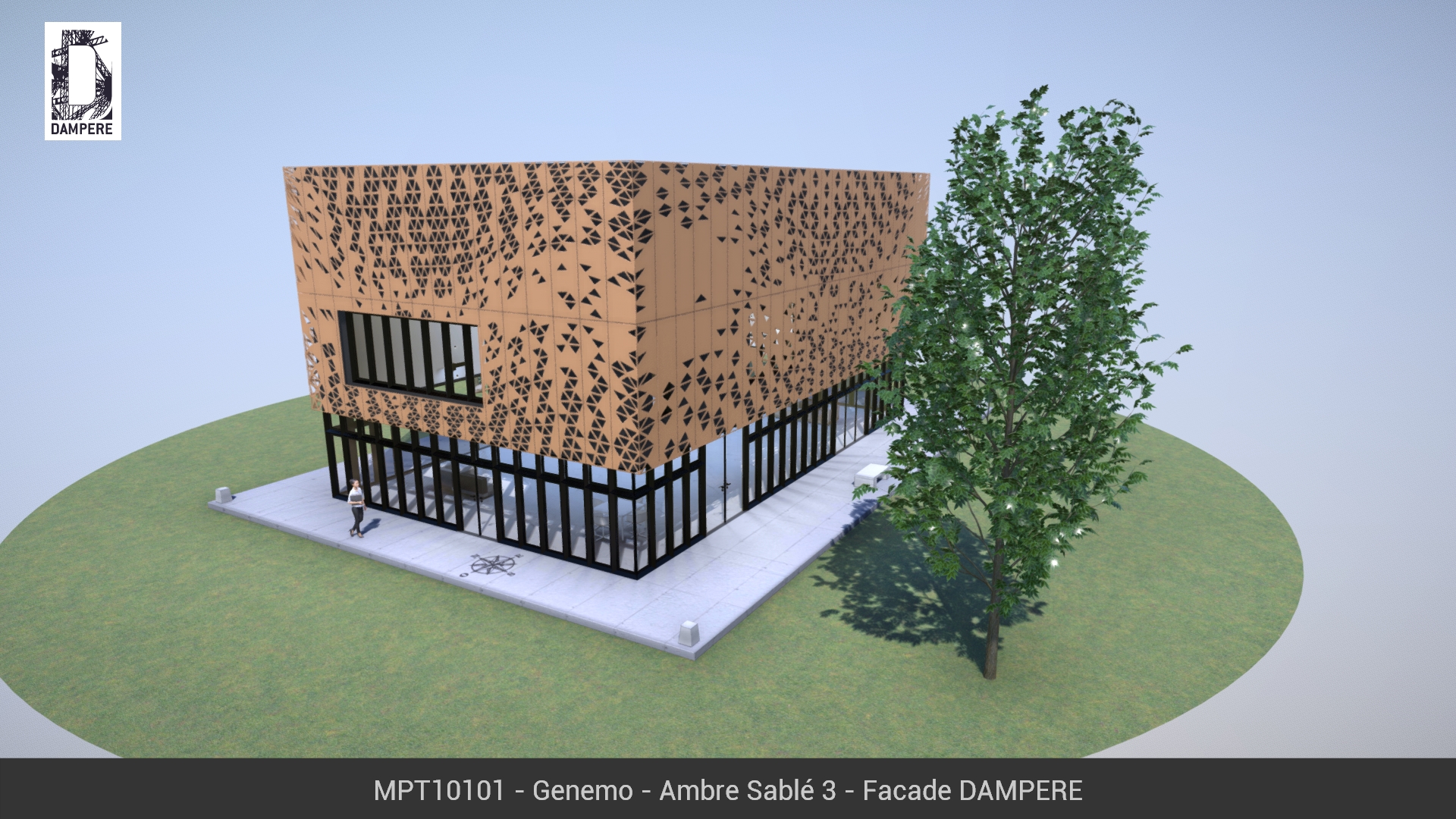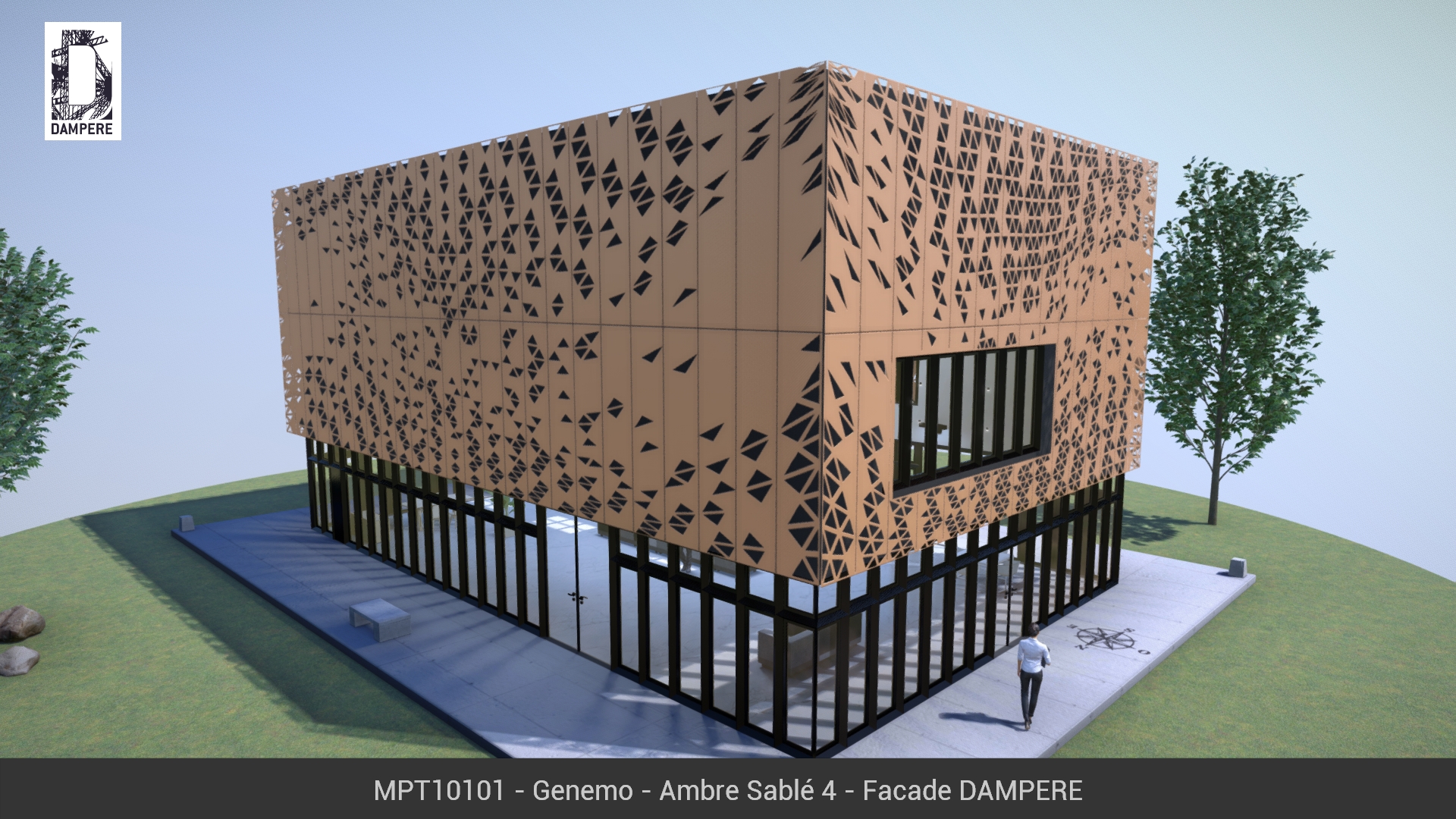 La façade métallique Genemo de DAMPERE se déploie comme une vague composée de triangles percés, parfois isométriques, ensuite déformés par le mouvement dynamique. Les formes ajourées se déplacent librement d’un côté à l’autre du Bâtiment dans une animation continue et fluide au regard.