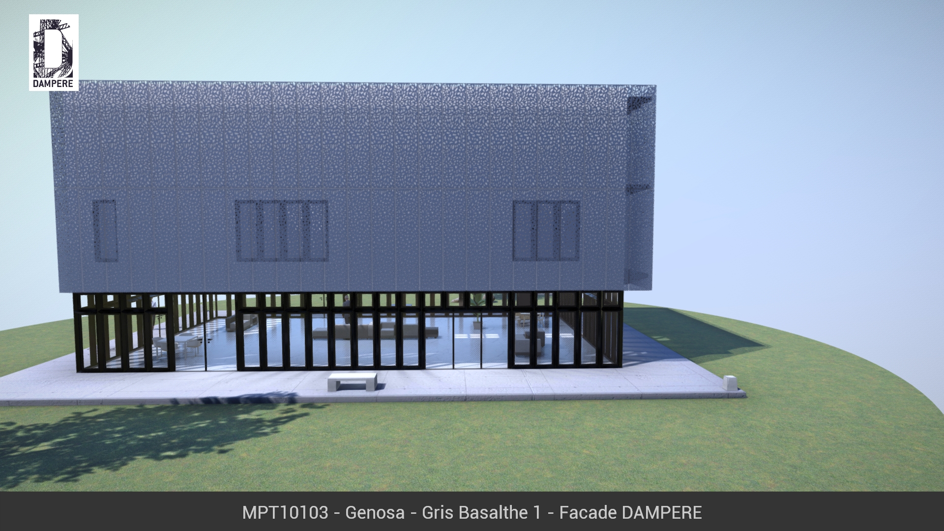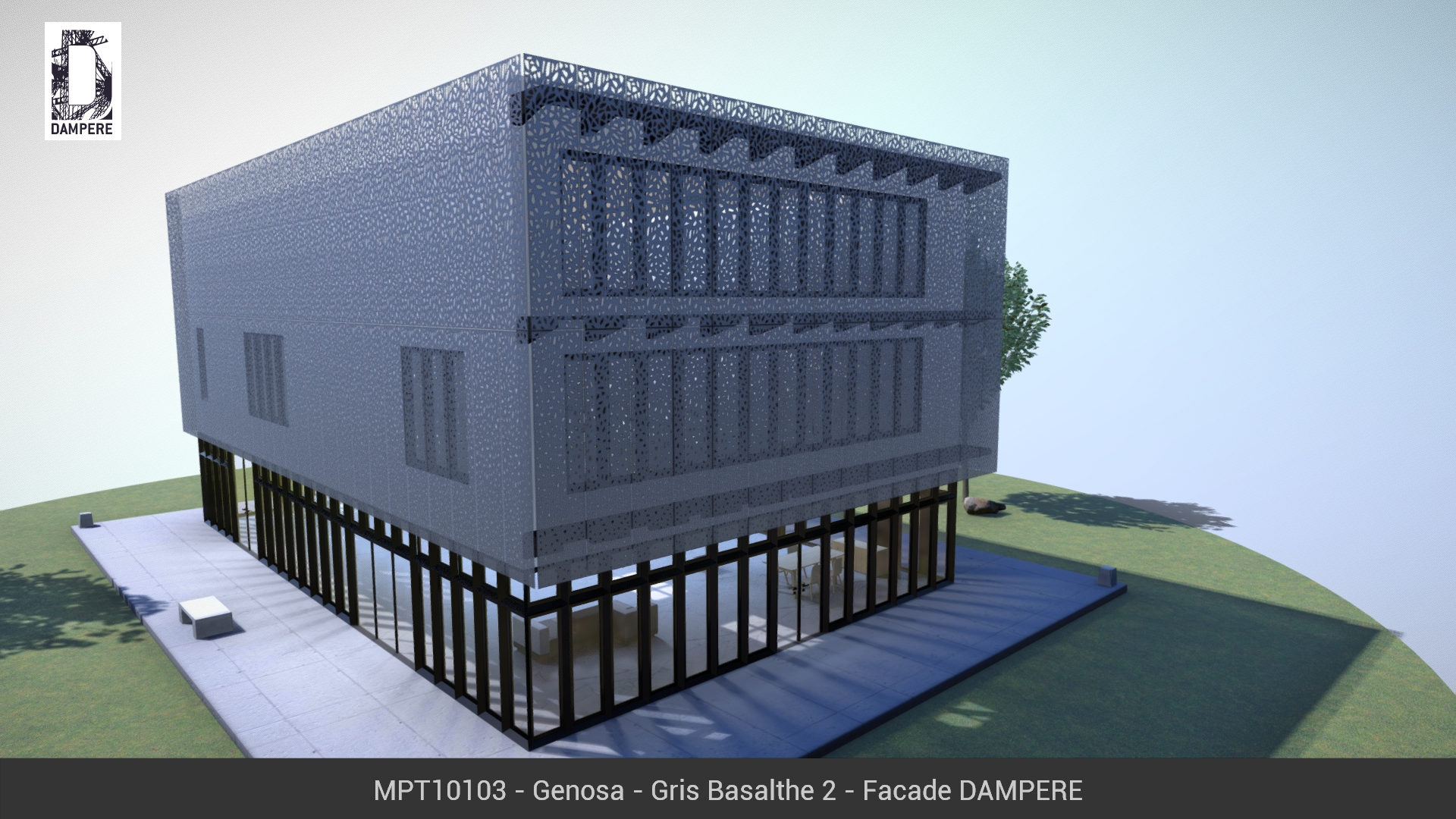 Le Bardage métallique Genosa de DAMPERE se développe de bas en haut de la façade dans un gradient linéaire. La partie supérieure représente une découpe au laser de formes végétales aux contours vifs et abruptes, en descendant les trous se réduisent de manière progressive.