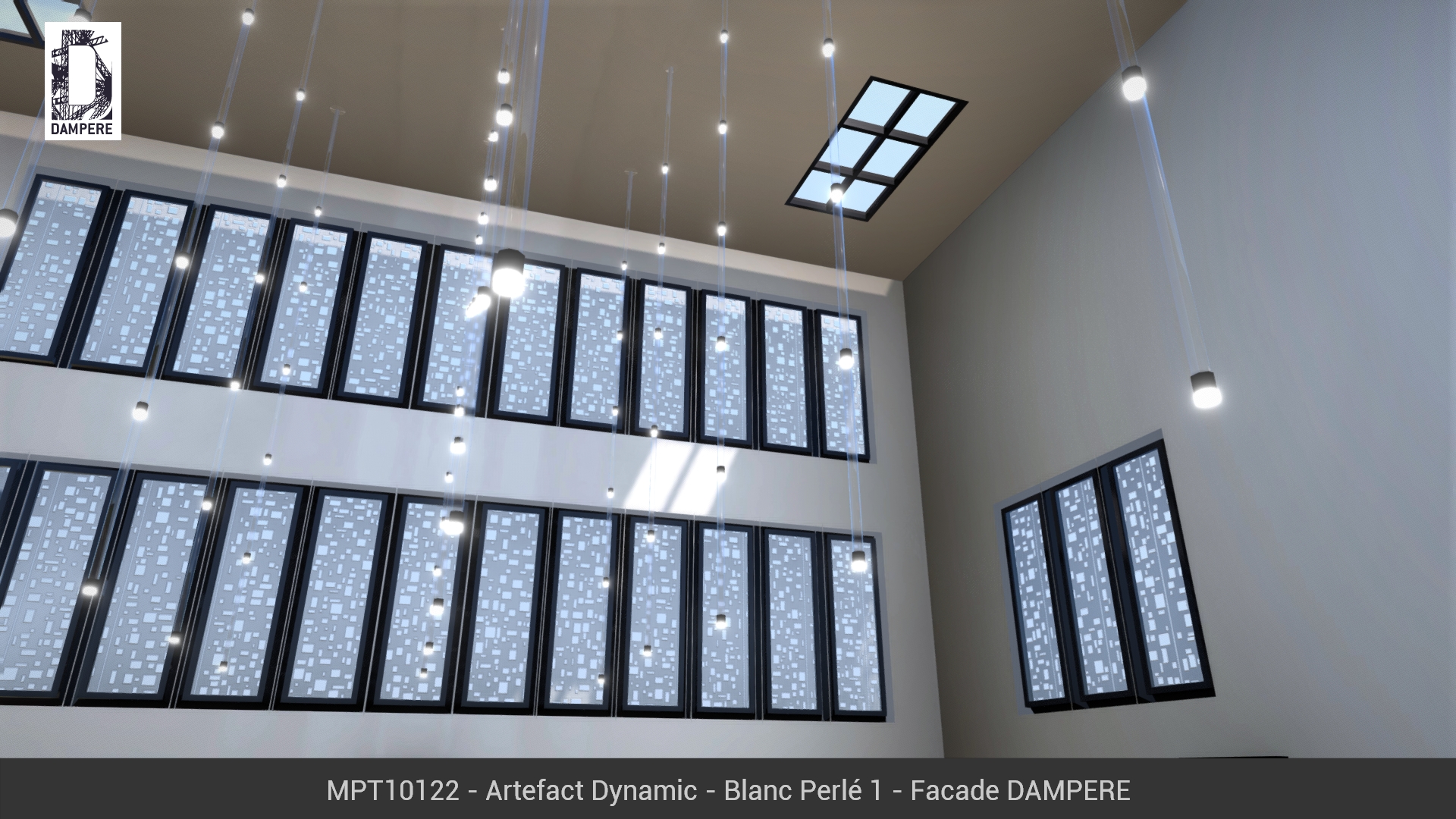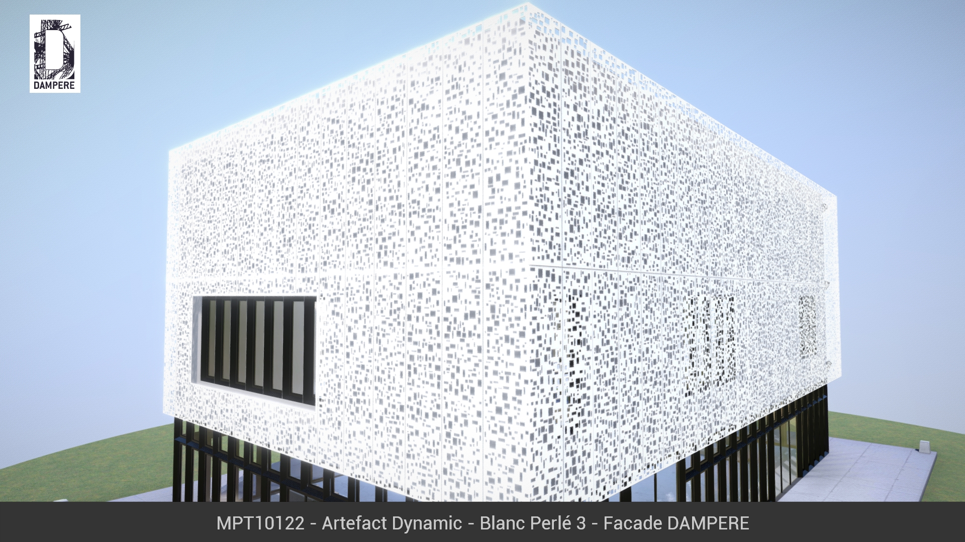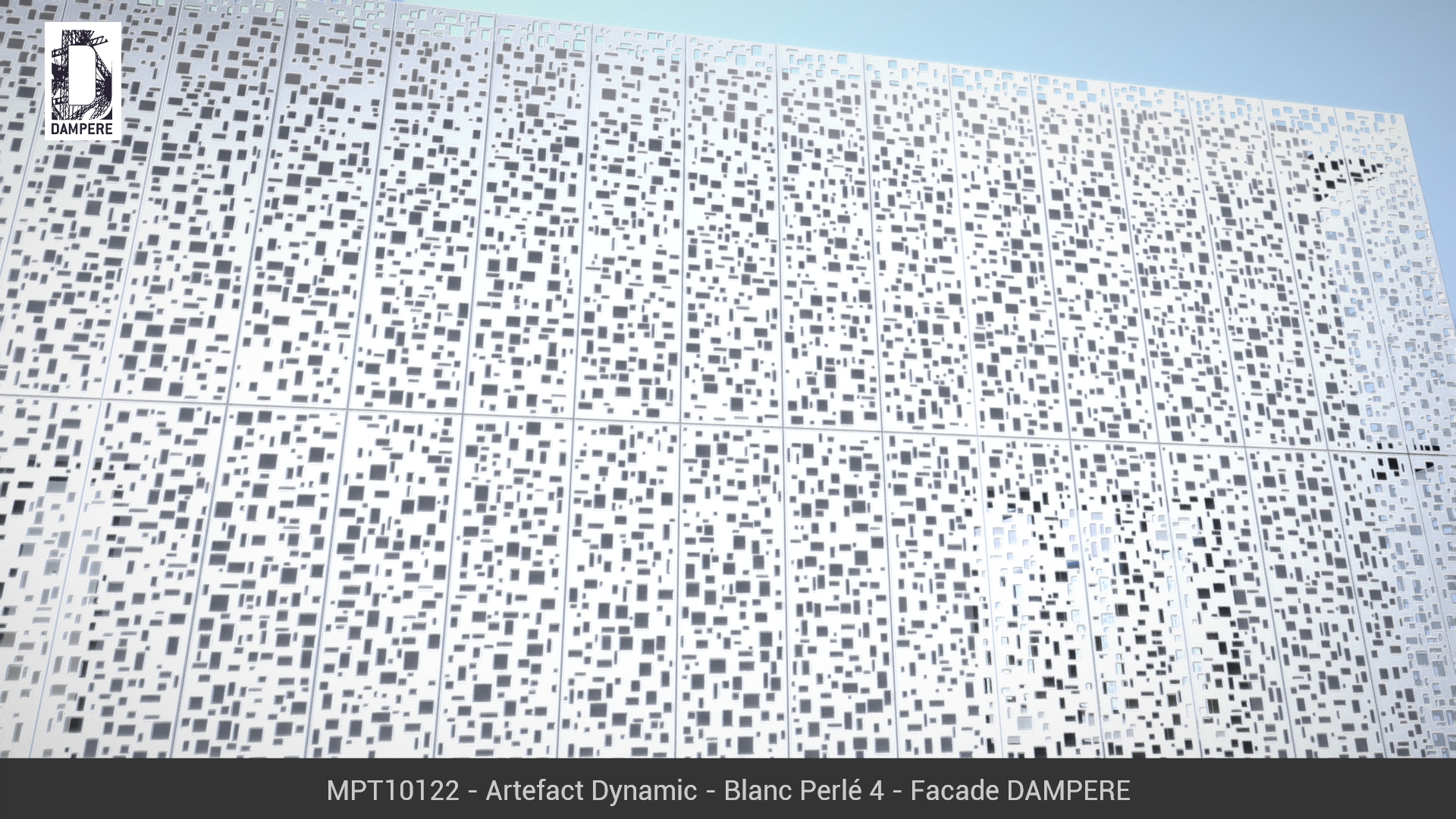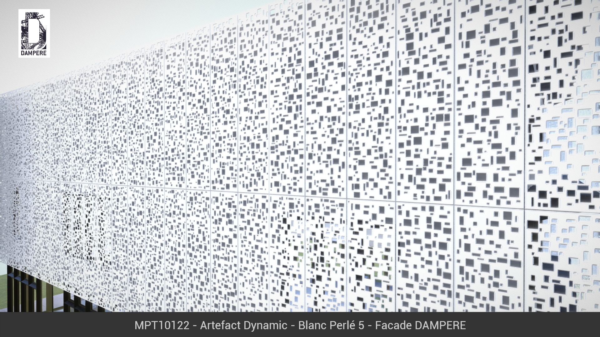 La façade décorative ARTEFACT DYNAMIC offre une découverte sans limite, libère l’esprit, ouvre à la poésie. L’observateur prend le temps d’observer, de dénicher la transparence au travers des vides carrés et rectangulaires. La vue de l’intérieur du bâtiment offre un effet de vitraux modernes.