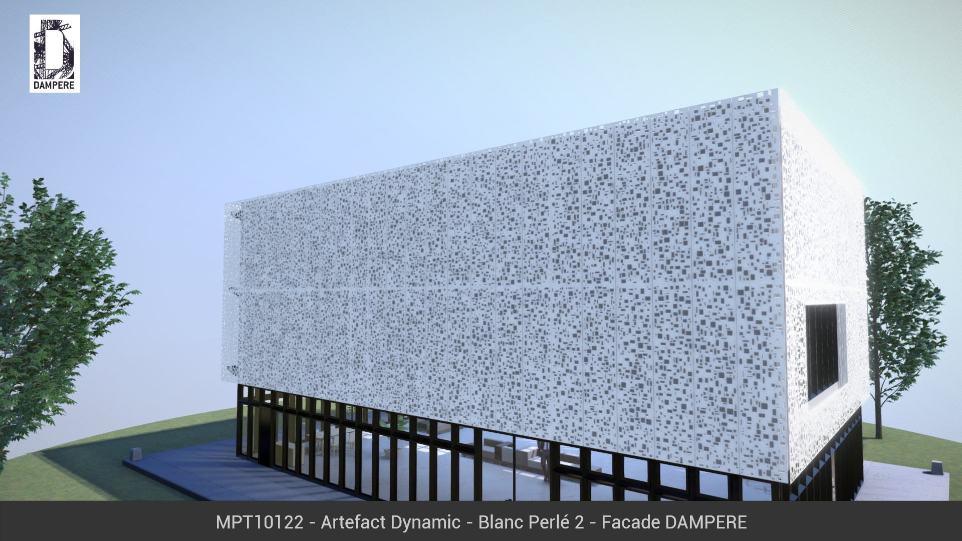 Les tôles décoratives Artefact Dynamic de DAMPERE affichent une grande toile mouchetée sur toute la façade. Chaque découpe est complètement affranchie pour que l’assemblage compose une peau métallique libre. Le motif représente légèreté et protection.