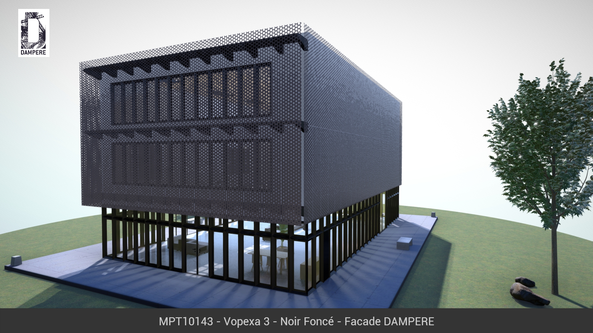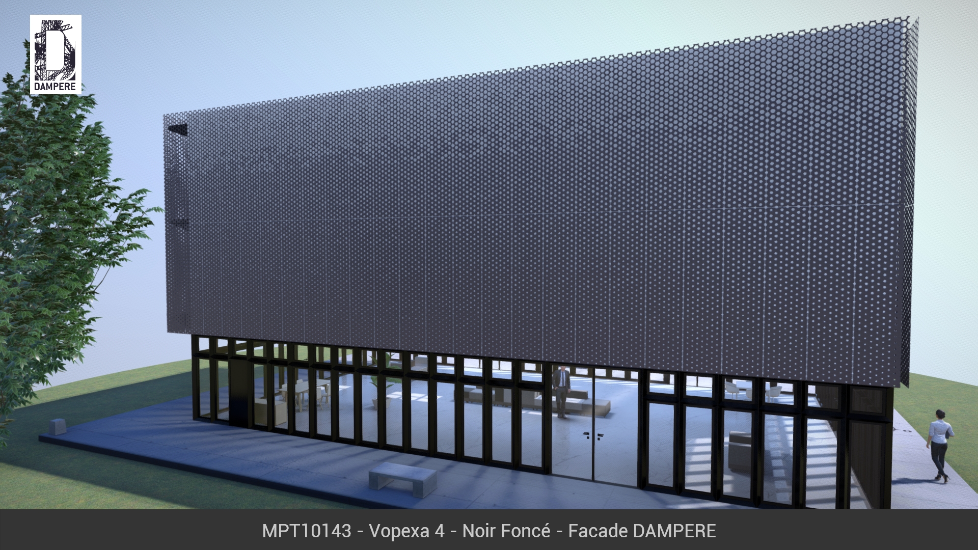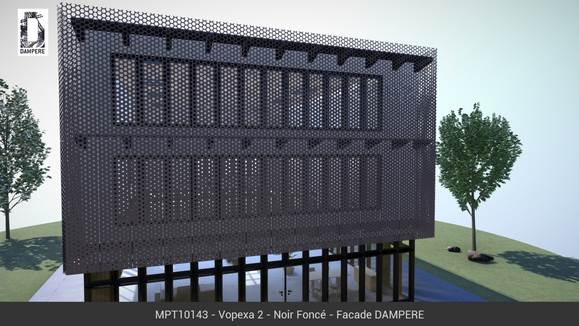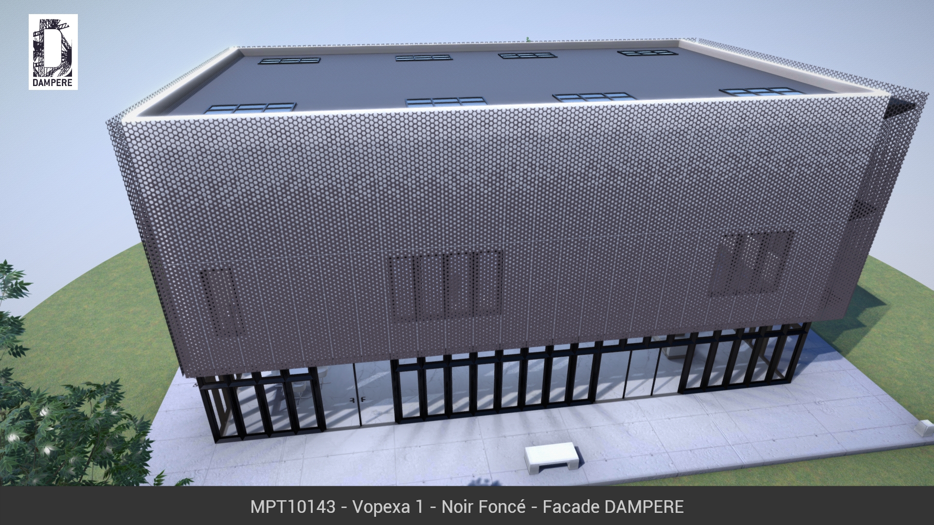 La façade dynamique Vopexa de DAMPERE traduit en image l’effet de sublimation, le passage d’un état dense et solide à un aspect léger et vaporeux. La taille des hexagones varie sur la hauteur du panneau métallique en gardant une rigueur physique et enrobé d’une douceur poétique.