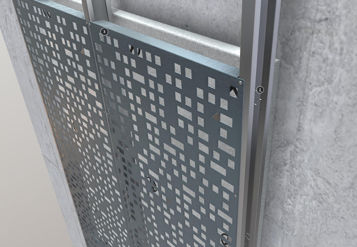 Les éléments de structure primaire et structure secondaire font partie de la façade car ils peuvent être vus, soit de manière discrète, soit complètement cachés. Le point de démarrage de l’étude technique sera le calepinage des panneaux. Selon les entraxes verticaux et horizontaux, il en résulte une trame rectangulaire recouvrant le bardage métallique. La résille de façade et son calepinage permettent de choisir le système de pose, lisses horizontales ou filantes verticales, panneaux à visser ou cassettes à clipper, toujours dans le respect des règles de l’art, toujours dans le respect de l’identité visuel de la façade.