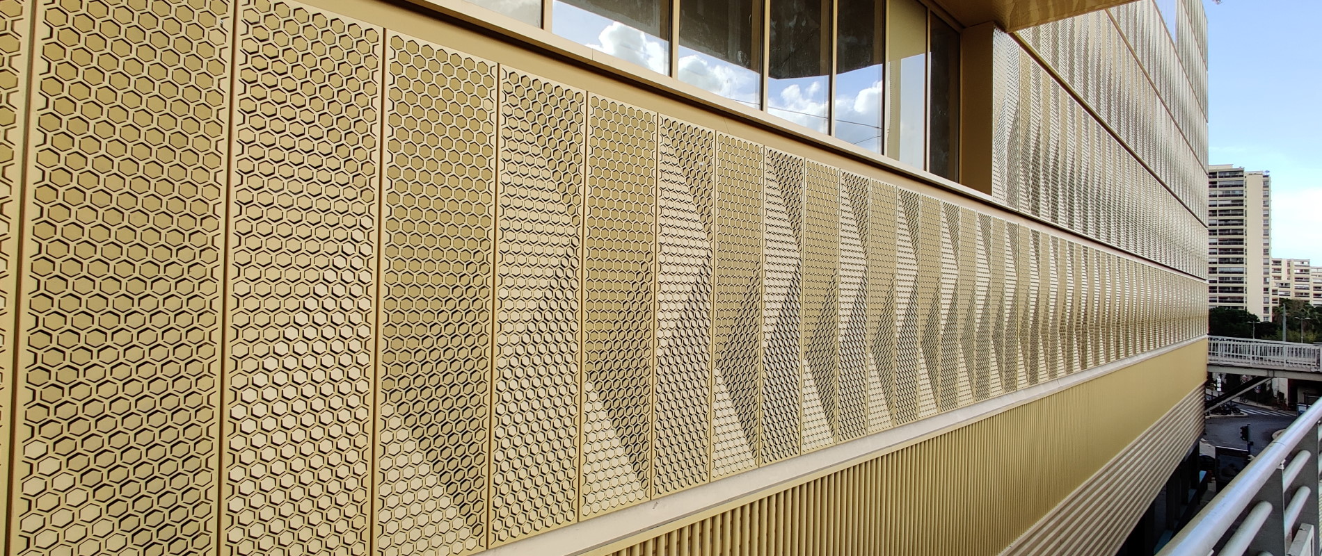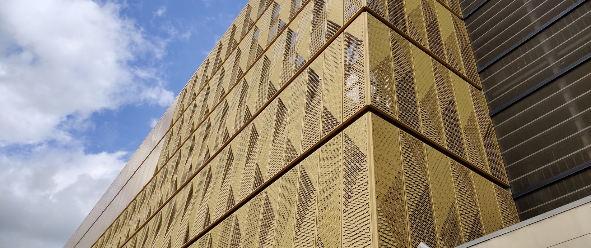 • Le réseau minime, la plus petite maille constituant la façade est un hexagone, polygone régulier à 6 sommets. Ces formes hexagonales en métal sont pivotées dans une orientation qui permet de créer un relief et conduit un reflet.