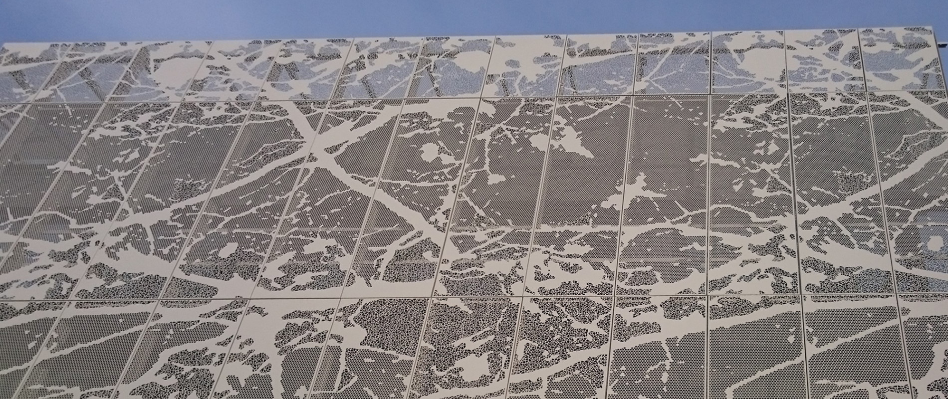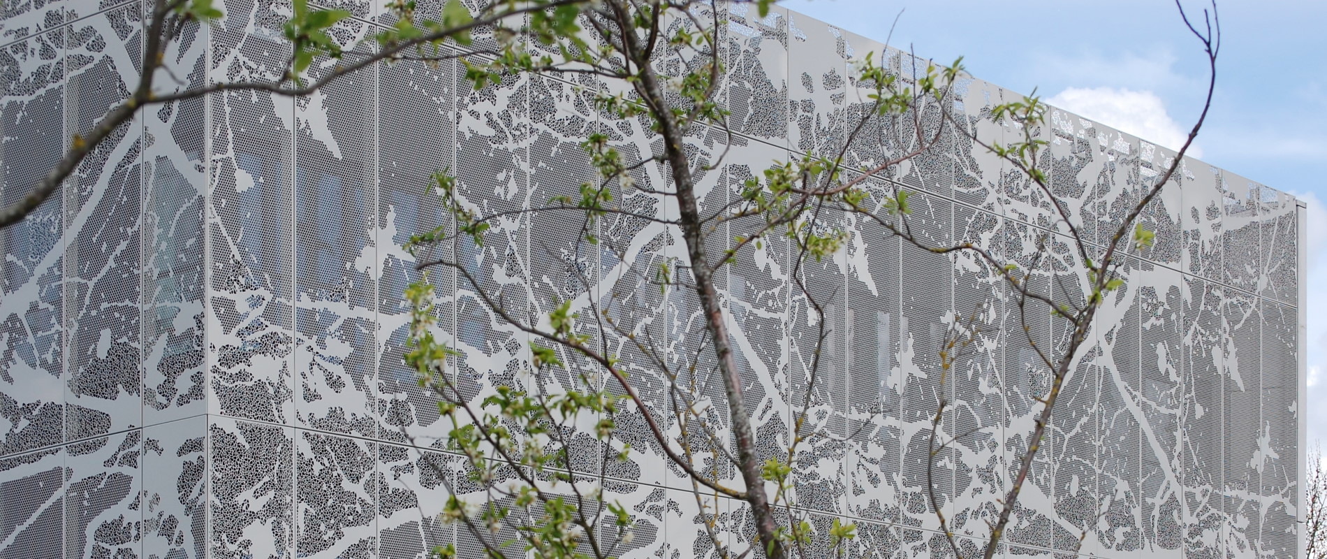 Ainsi les courbures végétales des arbres nus sont stylisés par les perforations ovalisés et tronquées et la lumière naturelle est invitée dans le Bâtiment, sublimée en passant par la facade en tôle perforée.