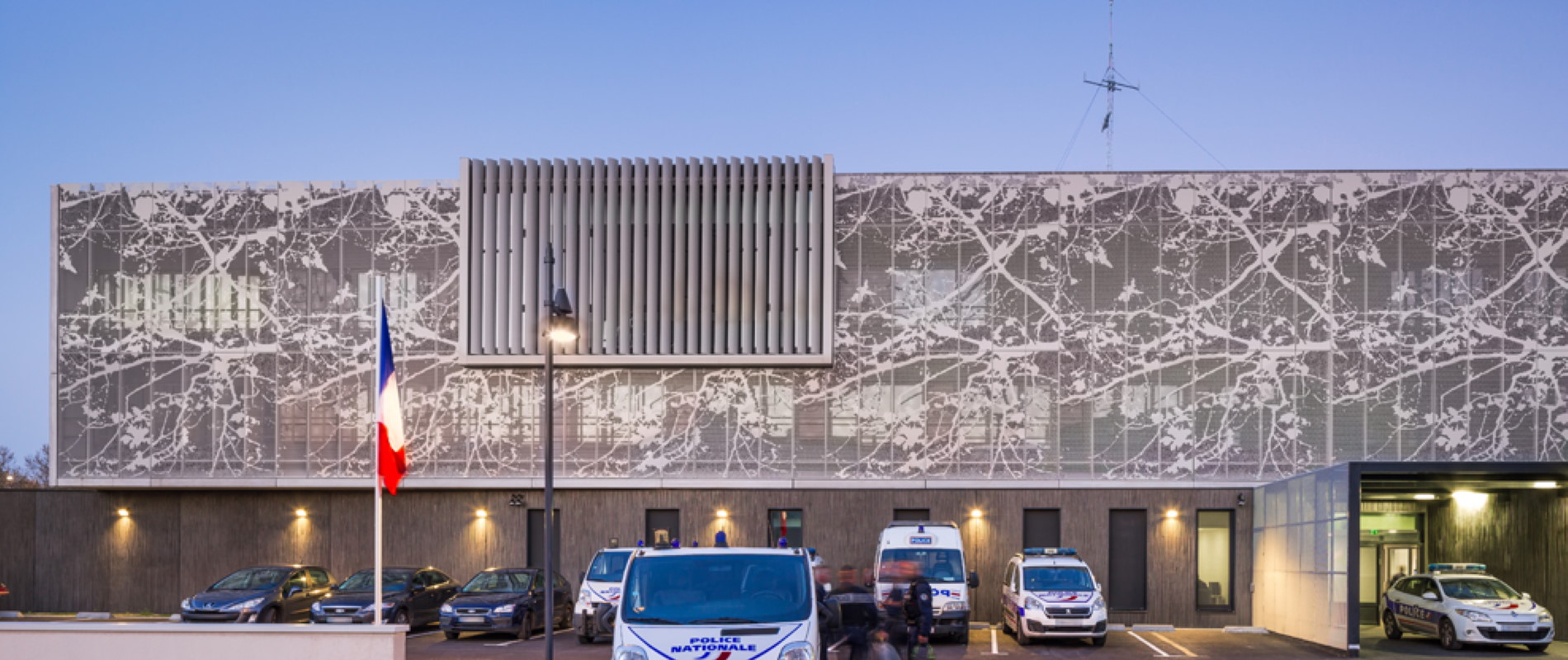 Les façades Sud et Ouest du Commissariat des Mureaux s’habille d’une toile métallique en tôle perforée, servant d’écran de diffusion solaire pour réduire les impacts thermiques du soleil. L’étude de la peau extérieure est un élément déterminant du confort HQE, intégrant à la fois l’effet brise soleil et l’effet brise vue.