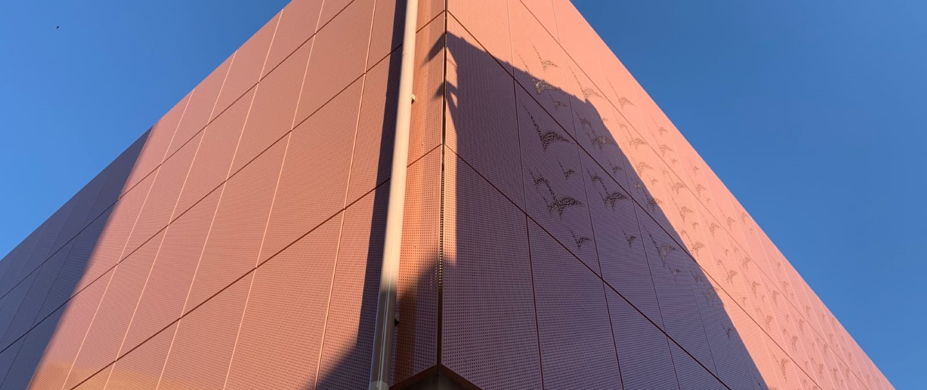 Les façades sont construites avec une perforation lisse et homogène pour garder la monotonie d’un mur en brique de terre cuite classique. Les panneaux qui couvrent les baies vitrées de la salle de sport sont composés de cassettes perforées bien plus ajourées pour laisser pénétrer plus de lumière dans le Bâtiment. Le traitement graphique de l’envol d’oiseaux basé sur le logo de la ville de Colombes a été choisi pour cette interprétation. L’observateur à l’intérieur de la salle de sport découvre par éclairage en contrejour, la lumière projetée du graphisme dynamique. En regardant de l’extérieur, nous découvrons sur la facade des tôles perforées toutes différentes pour reconstituer la cinétique d’une envolée d’oiseaux.