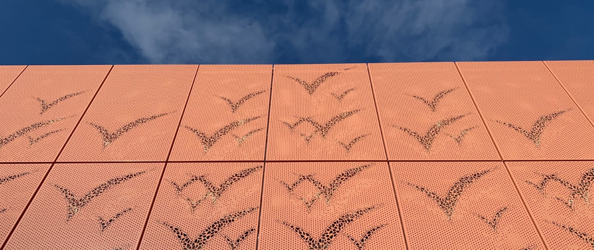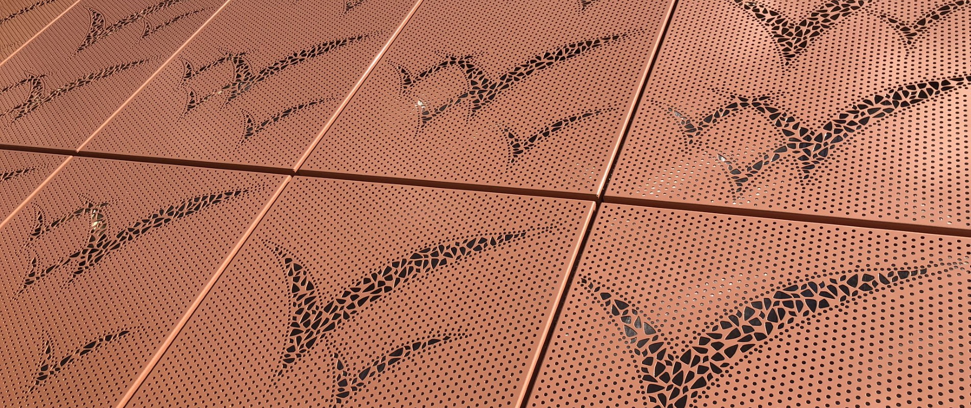 Cassettes pliées avec un motif en tôle perforée réalisé sur mesure exprimant le « mouvement d’envol d’un groupe d’oiseaux » grâce au procédé PiTo-TECH