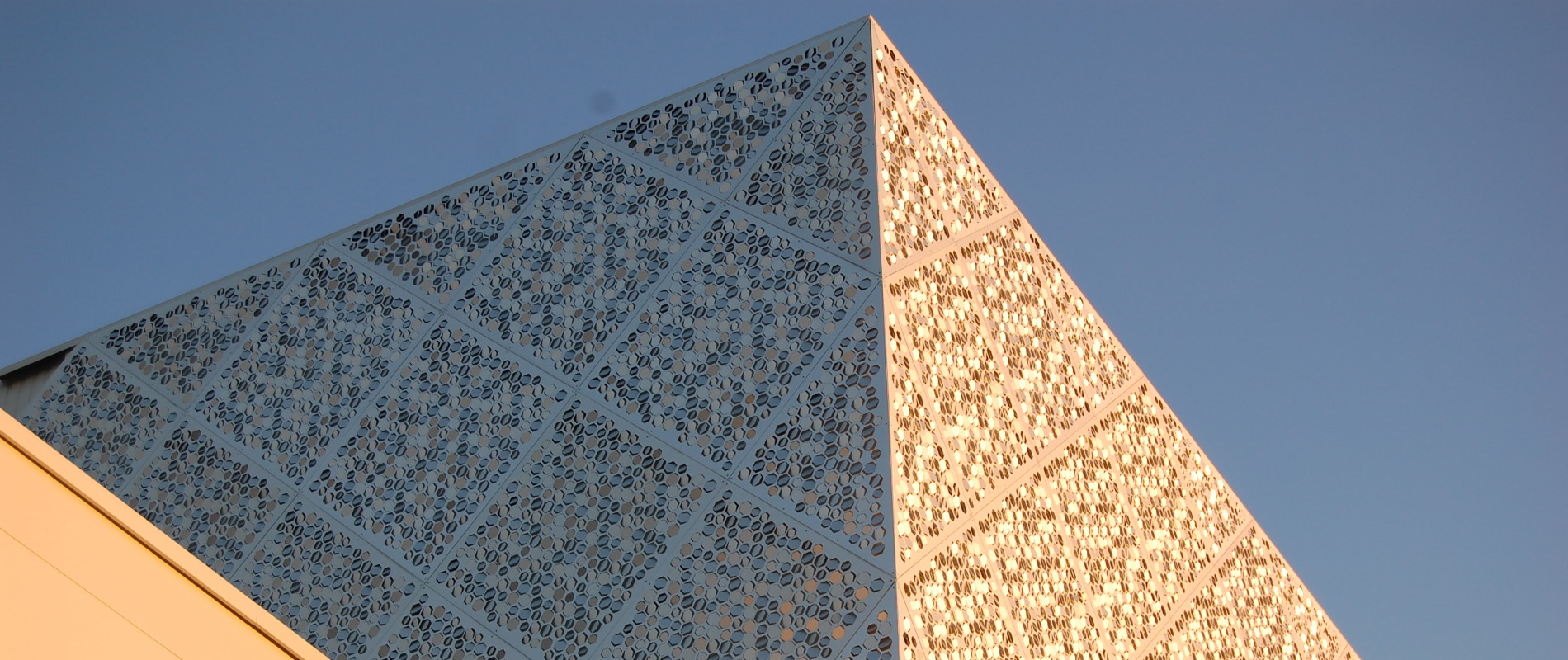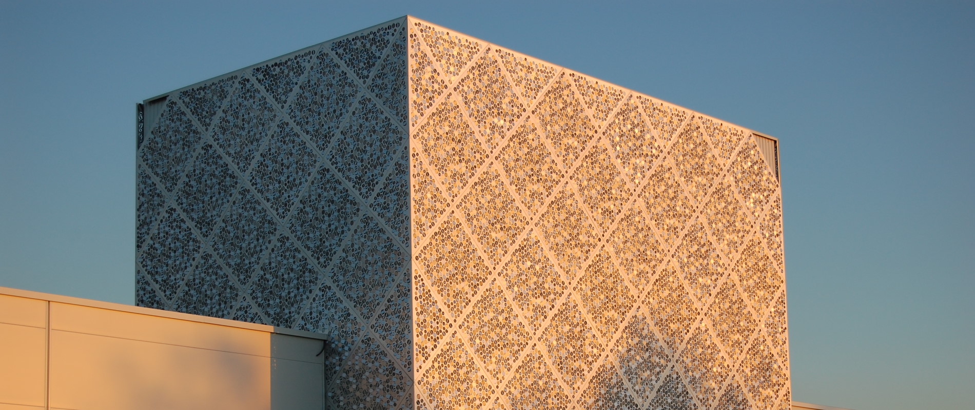 La réussite de l’effet résulte de la distribution des écailles hexagonales pivotées selon différentes orientations pour attirer les rayons lumineux. Le bardage en aluminium anodisé de la façade métallique a été soigné pour mettre en scène une myriade de points lumineux qui scintillent selon la période de la journée mais surtout la position de l’observateur.
