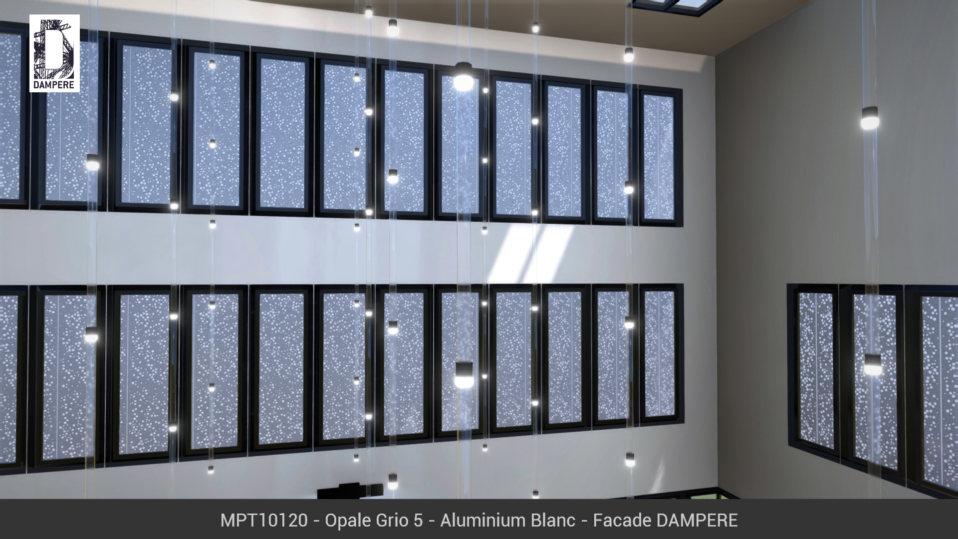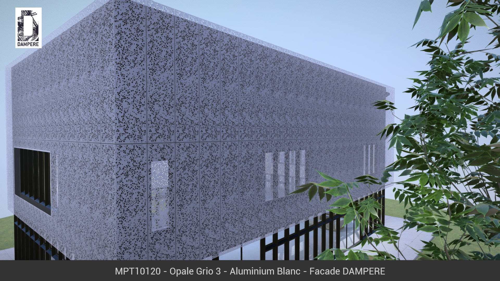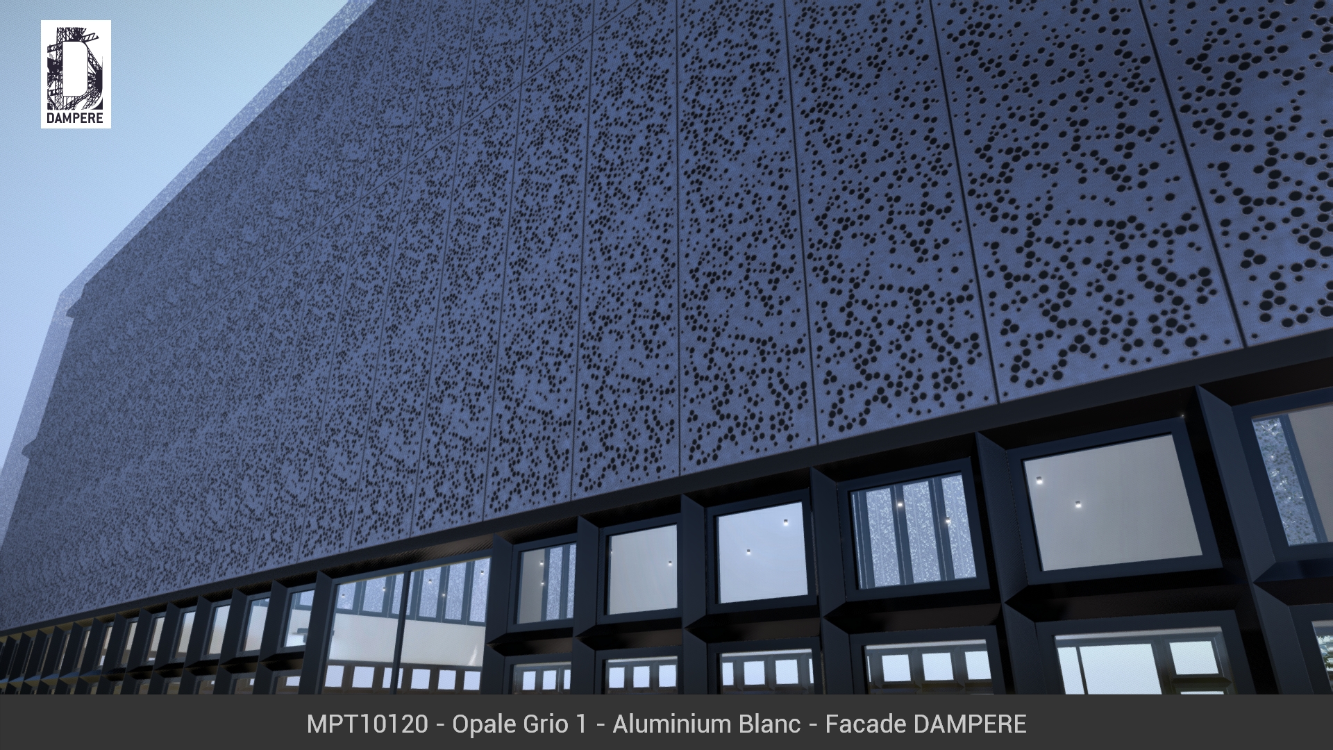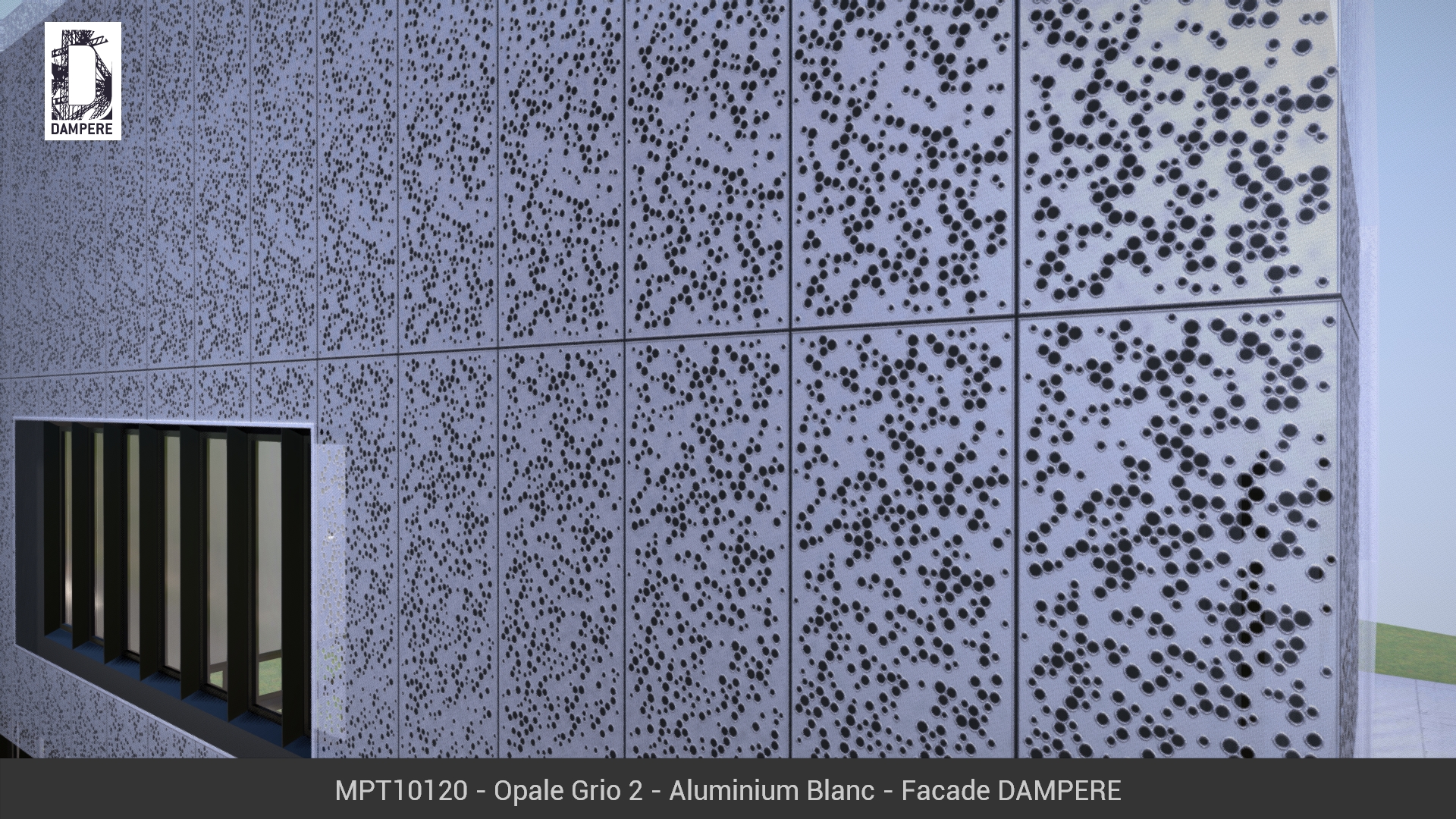 La tôle perforée Opale Grio de DAMPERE dérange des ronds de tailles différentes qui se regroupent en nuages de points. Les particules s’agglomèrent en réunissant à la fois les petits ronds et les grands trous. Le même panneau se répète sur la façade créant une texture drapée.