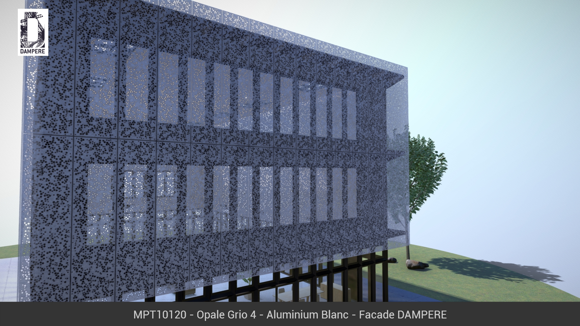 La façade en tôle perforée OPALE GRIO déploie une texture particulière, chargée de dynamisme, mélange opacité et transparence. S’utilise facilement quand on doit laisser passer la lumière au droit des fenêtres.
