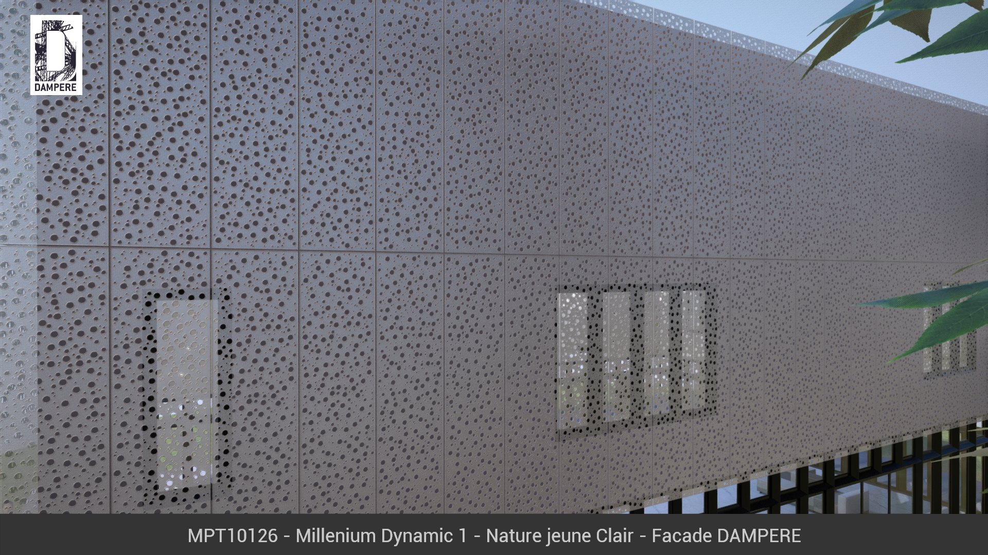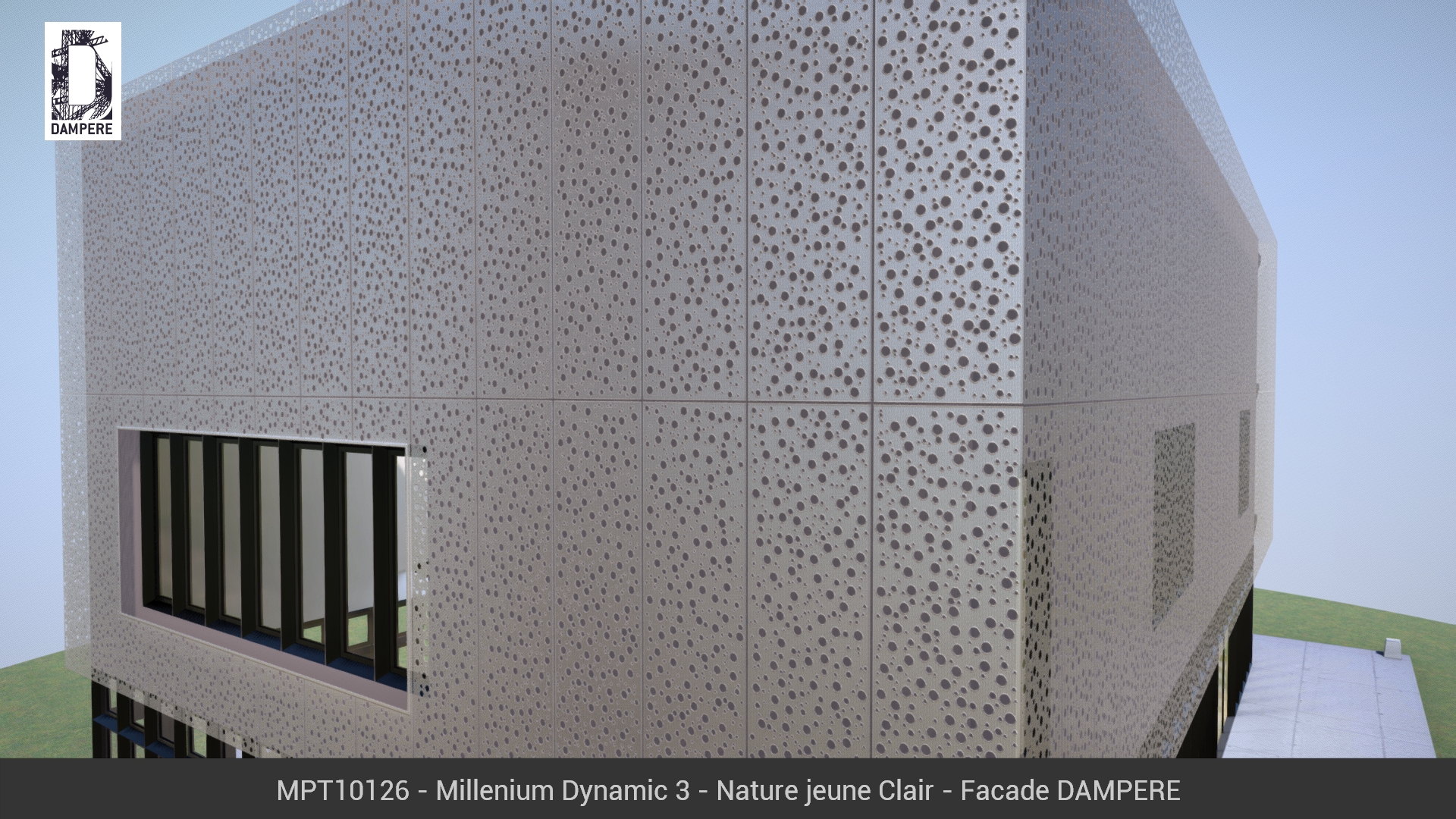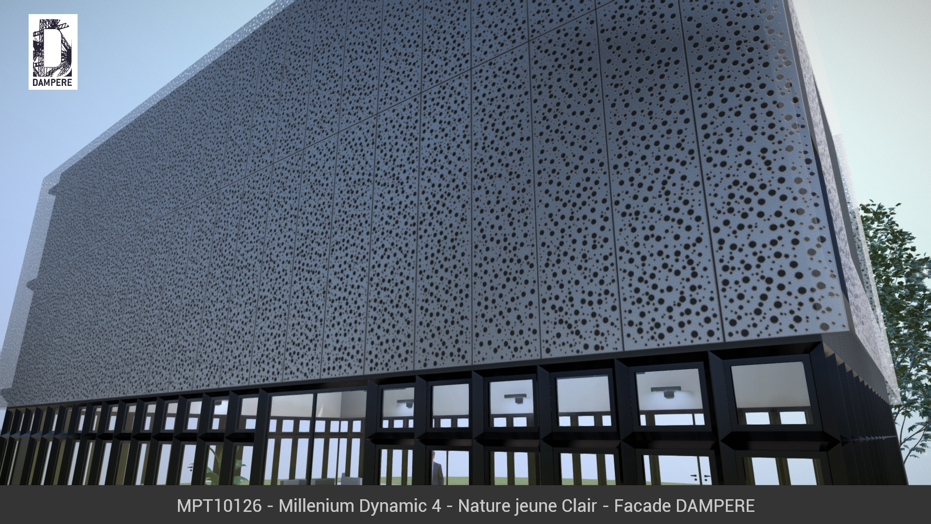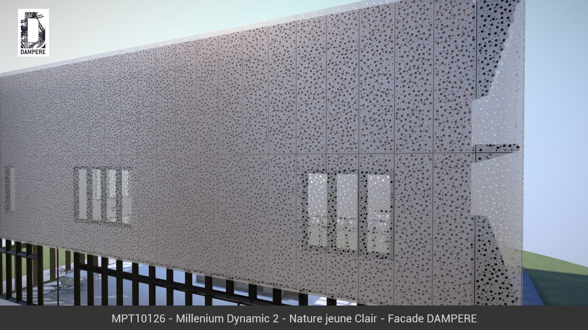 La façade en tôle perforée MILLENIUM DYNAMIC présente un flux continu, symbolise le mouvement perpétuel de la Terre vers le Ciel. Dynamisme doux et facile à intégrer dans un projet.