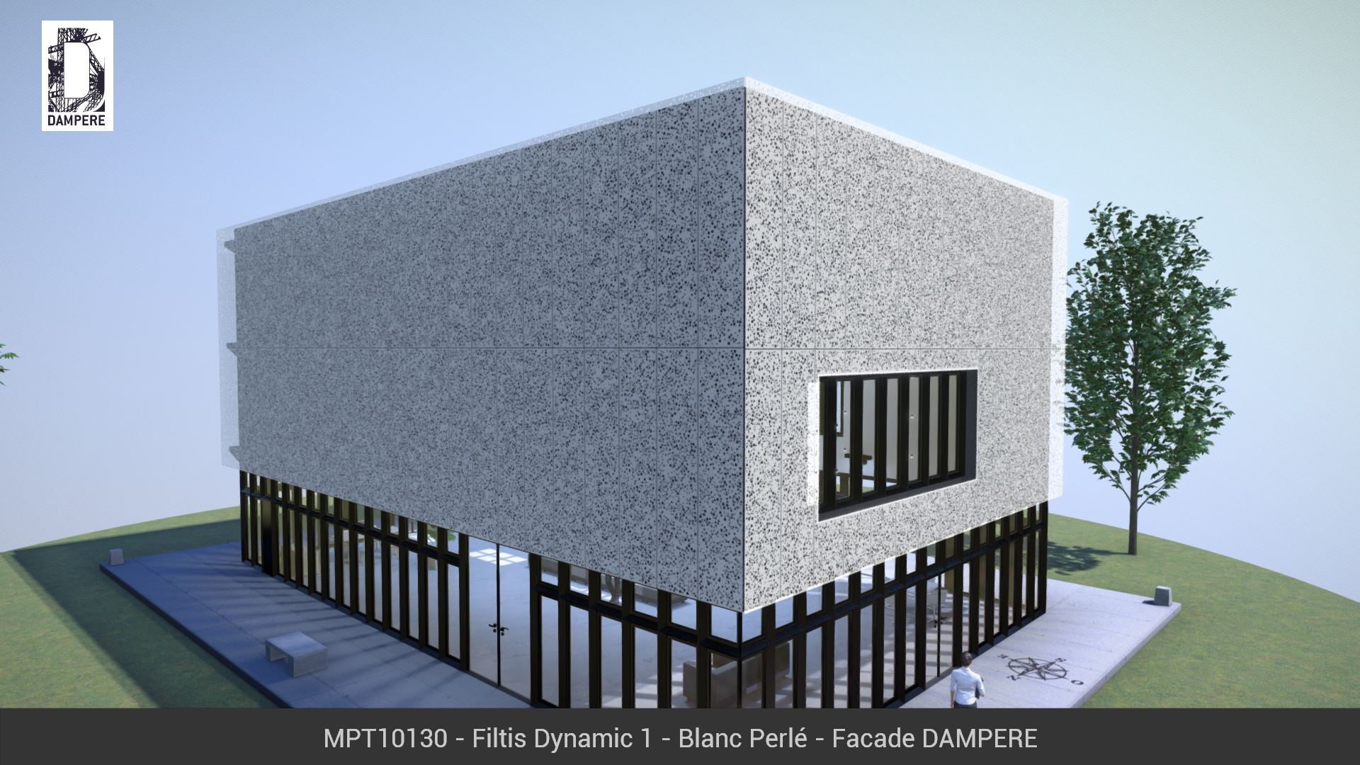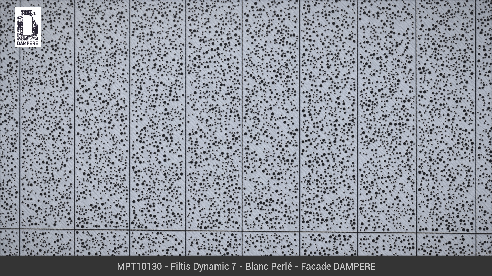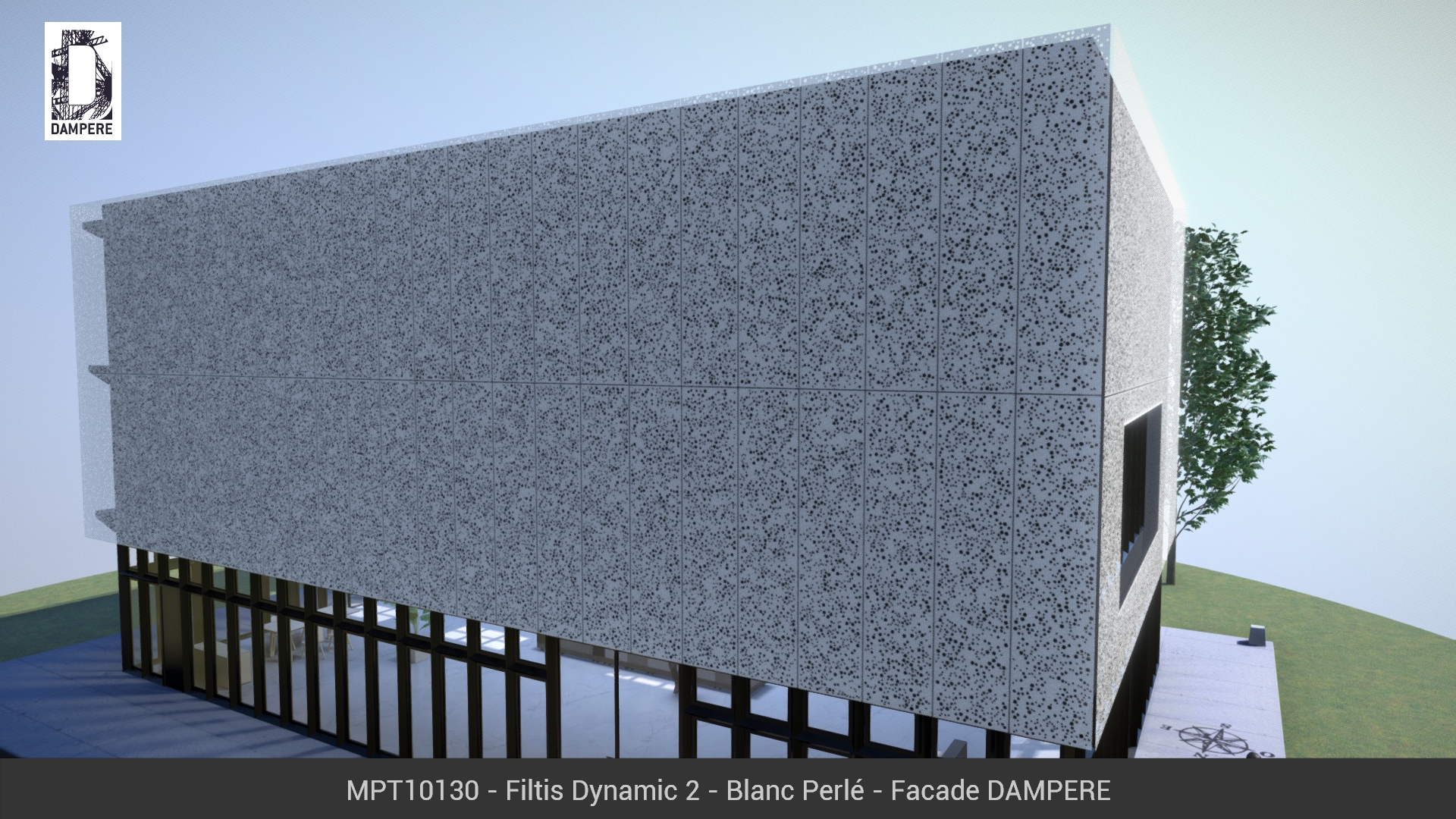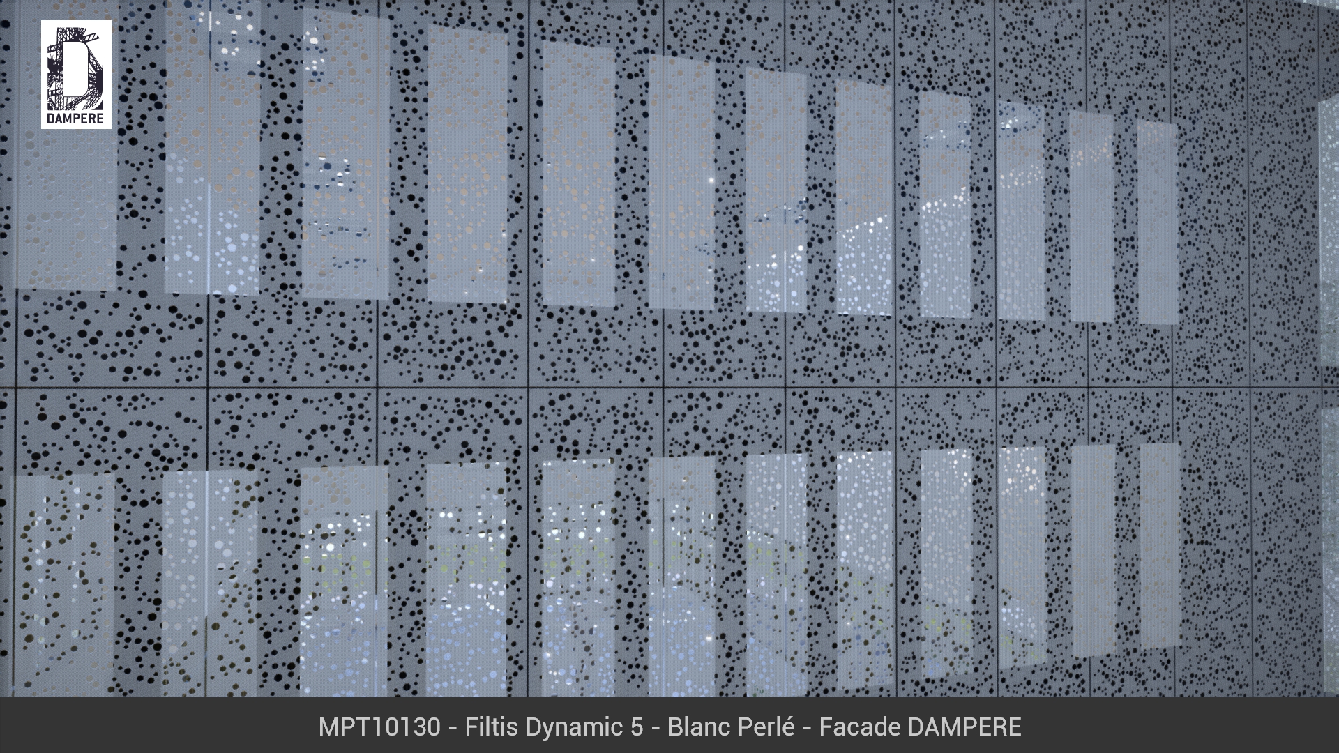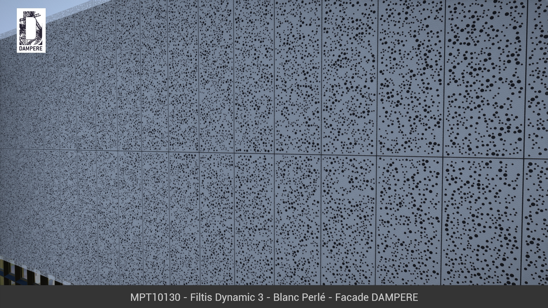 Les tôles perforées Filtis Dynamic de DAMPERE composent une toile tiquetée sur l’étendue de la façade, des ronds déposés inégalement sur chaque pièce métallique pour assurer un dynamisme incessant. Motif aléatoire évoquant une régénération.